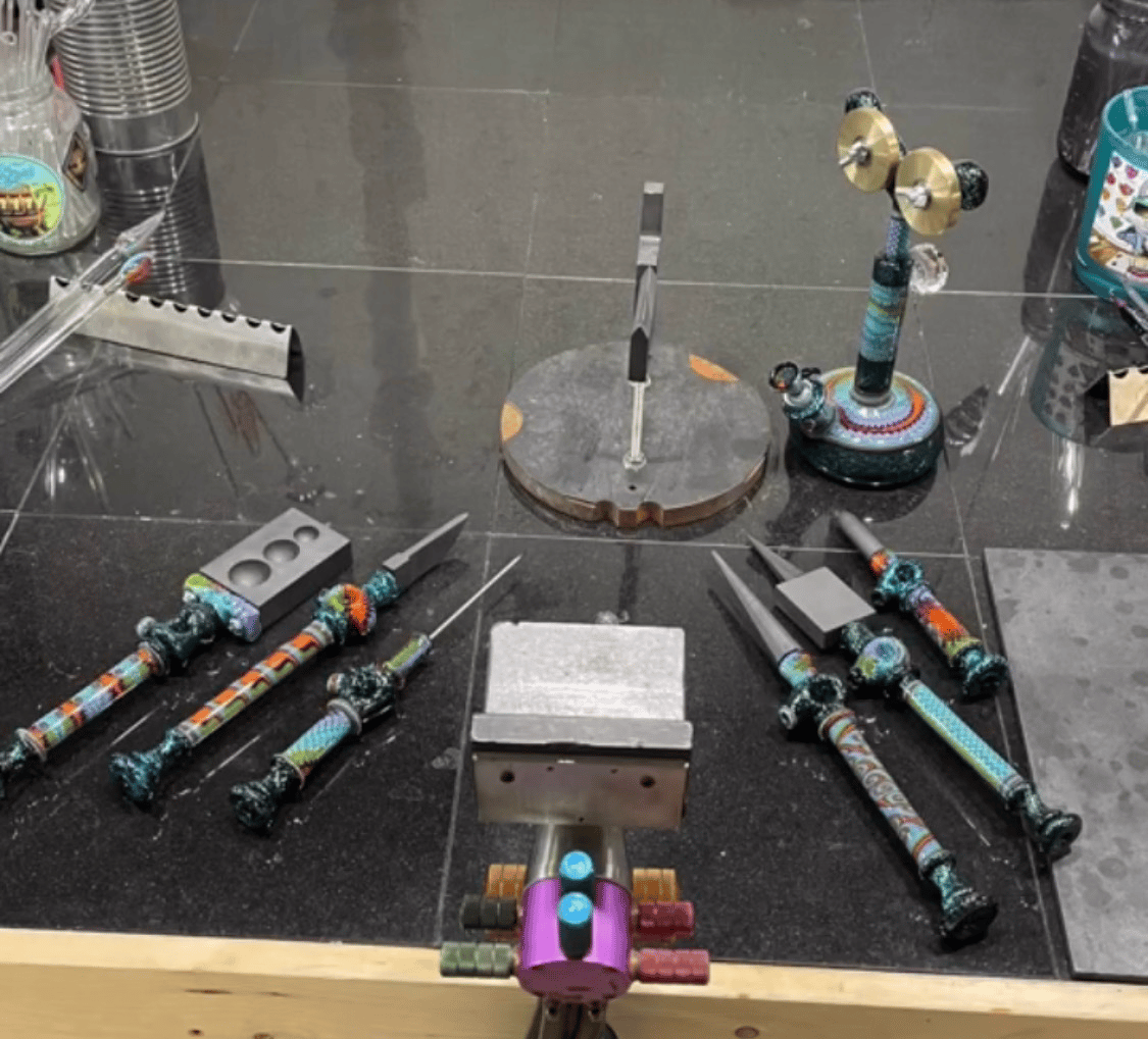 A pipe makers tool kit. My entry into the 2023 glass Vegas comp receiving 3rd place. A set of glass pipe tools made to replicate with dual function all my most important hand tools I use on my bench. I made each one with unique patterns to match their personality's. All are dry pieces except the yoke roller which is a water piece. Please check out more videos and pics of these on my Instagram "Nateylove" and let me know if you have any questions or have a serious offer on this one of a kind installation set. Cheers!